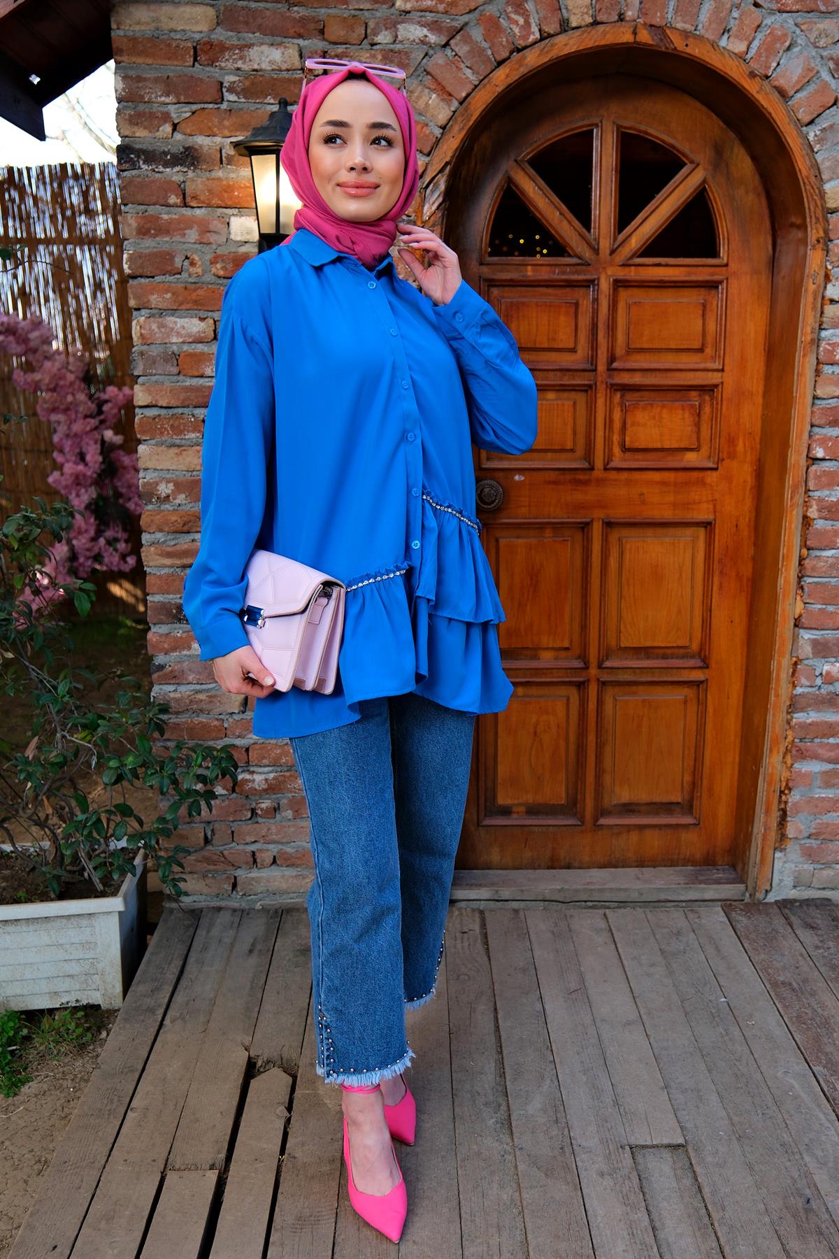 TAS ZINCIR DETAYLI TERIKOTON GOMLEK MAVI