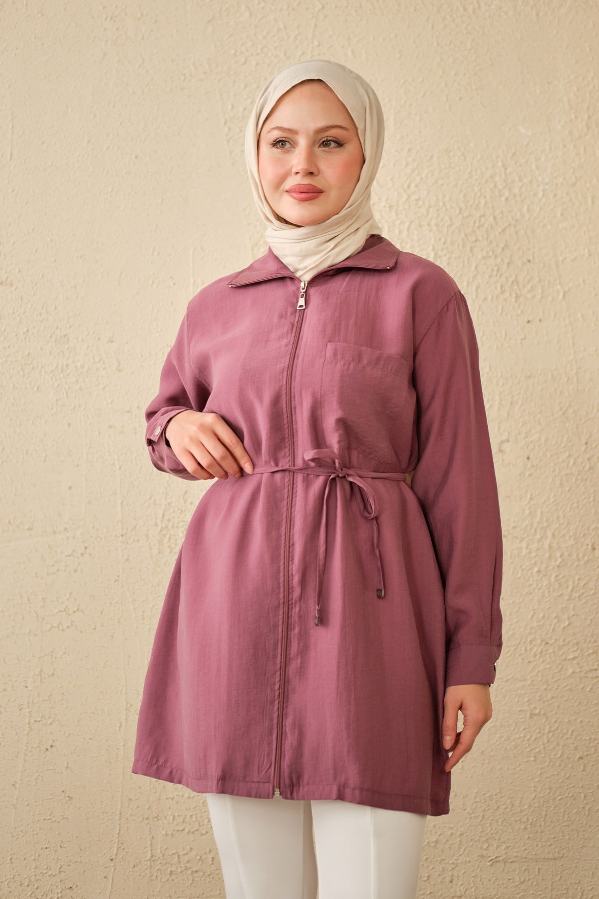 Tek Cepli Bel Bağlamalı Fermuarlı Hırka Mürdüm