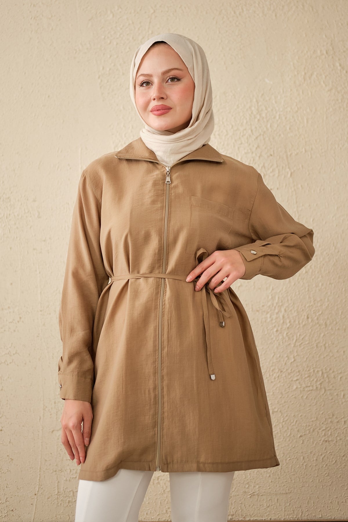 Tek Cepli Bel Bağlamalı Fermuarlı Hırka Vizon