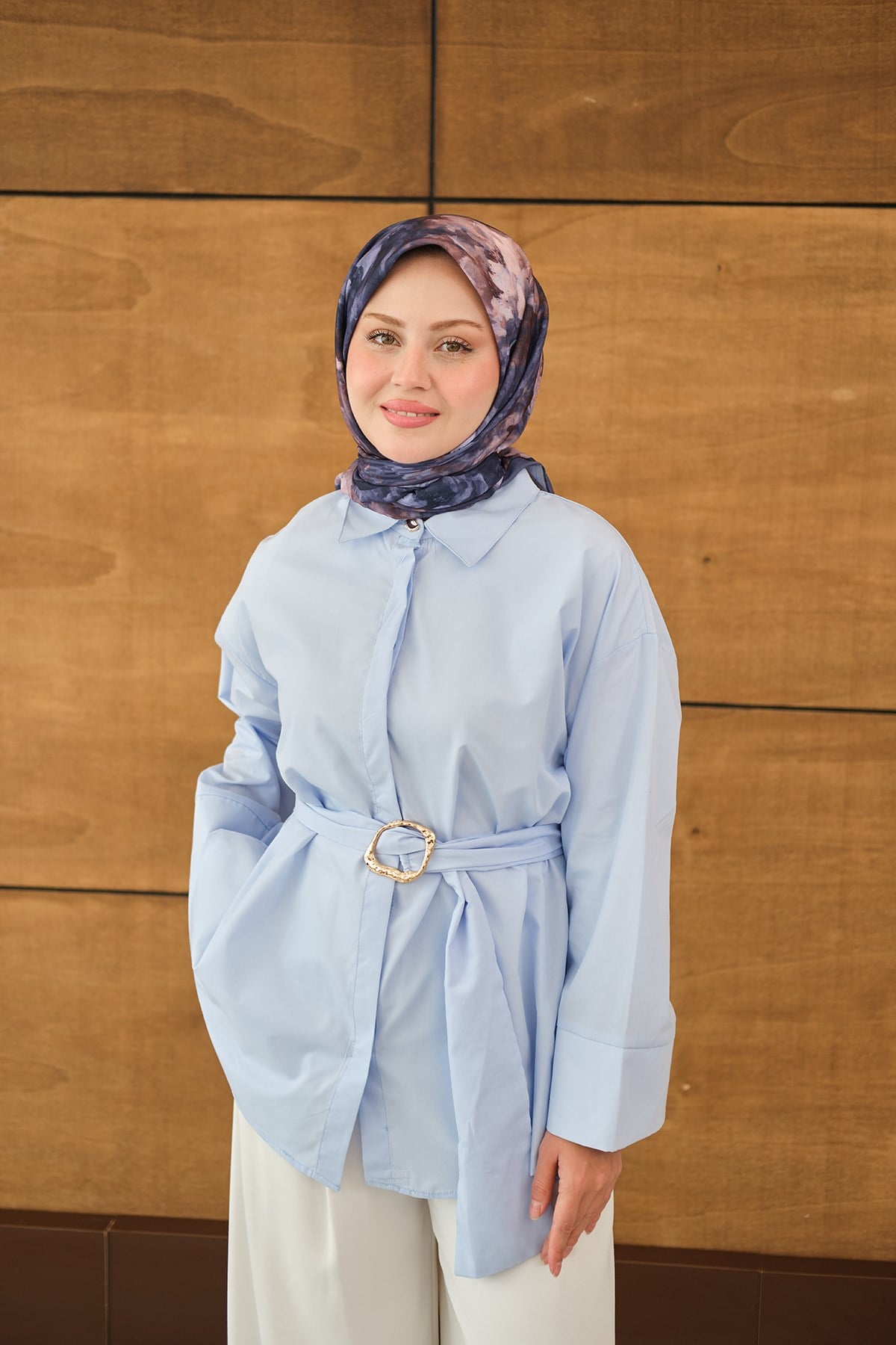 Toka Detaylı Uzun Kuşaklı Gömlek Bebe Mavi