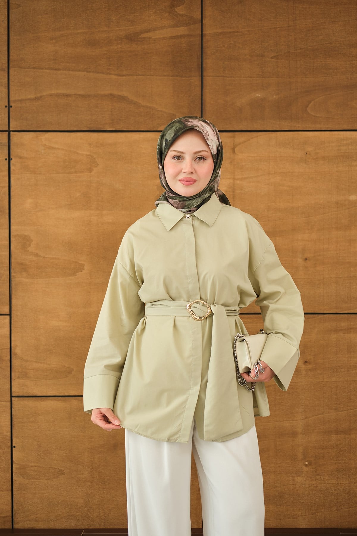 Toka Detaylı Uzun Kuşaklı Gömlek Küf Yeşil