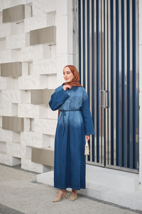 Tonsürton Detaylı Bel Bağlamalı Kot Elbise Mavi