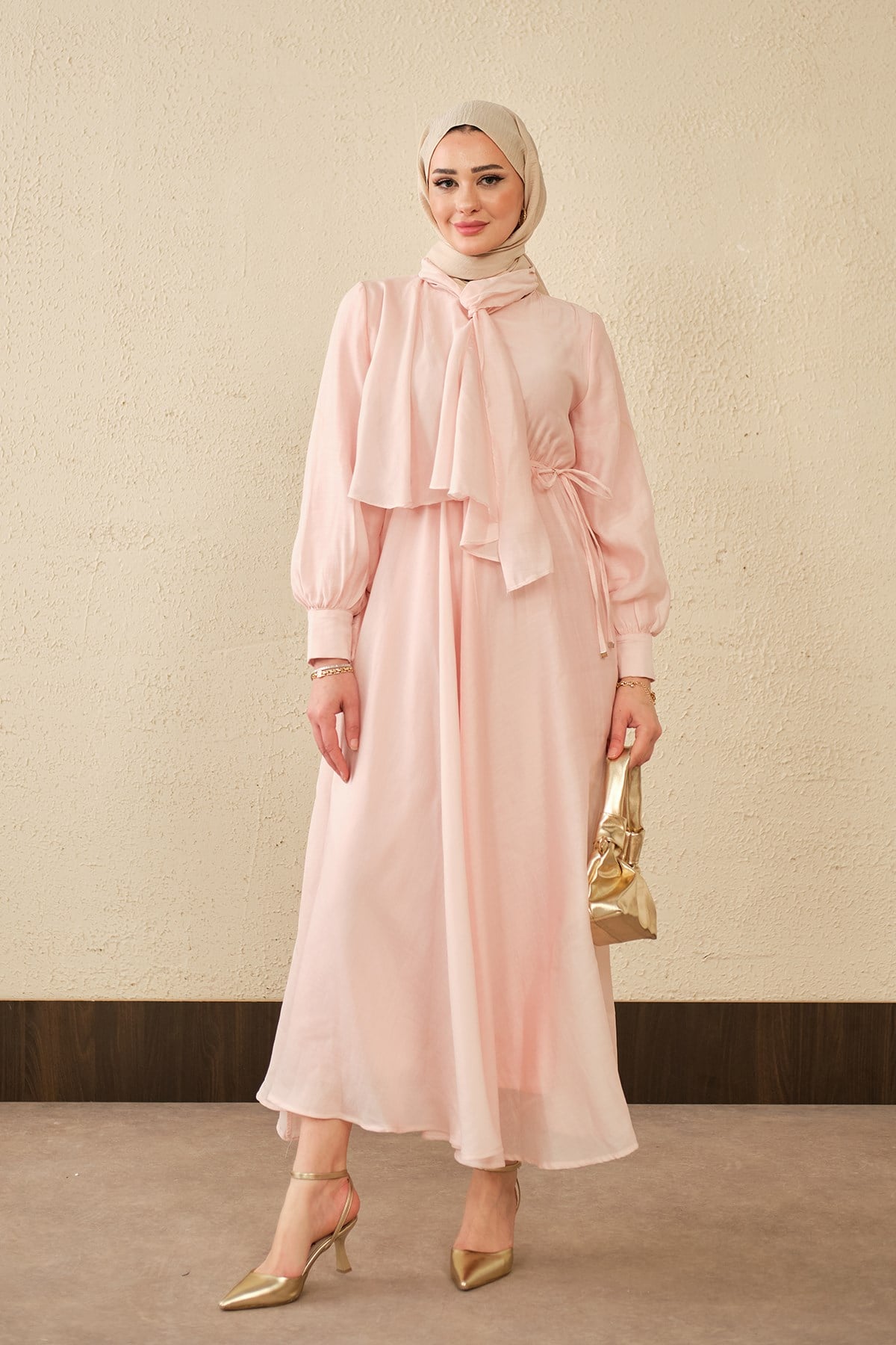 Tül Detay Şal Yaka Bel Bağlamalı Elbise Pembe