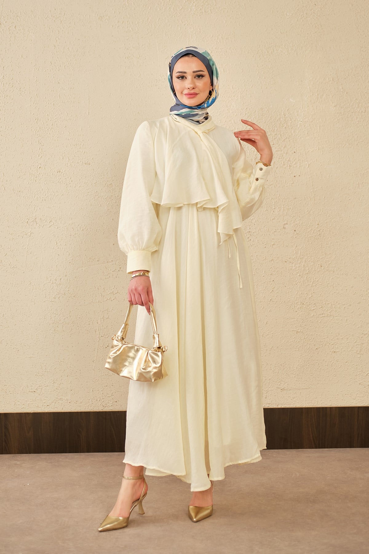 Tül Detay Şal Yaka Bel Bağlamalı Elbise Sarı
