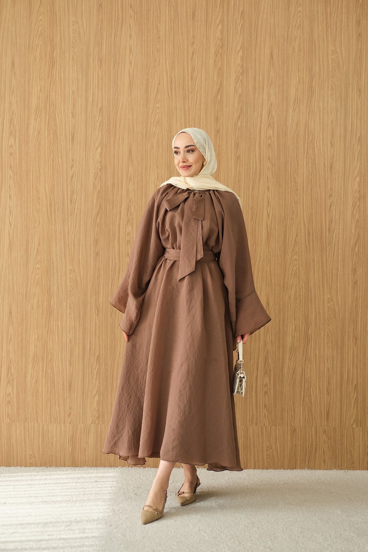 Tül Kumaş Boyun Bağlamalı Detaylı Bel Bağlamalı Elbise Kahverengi