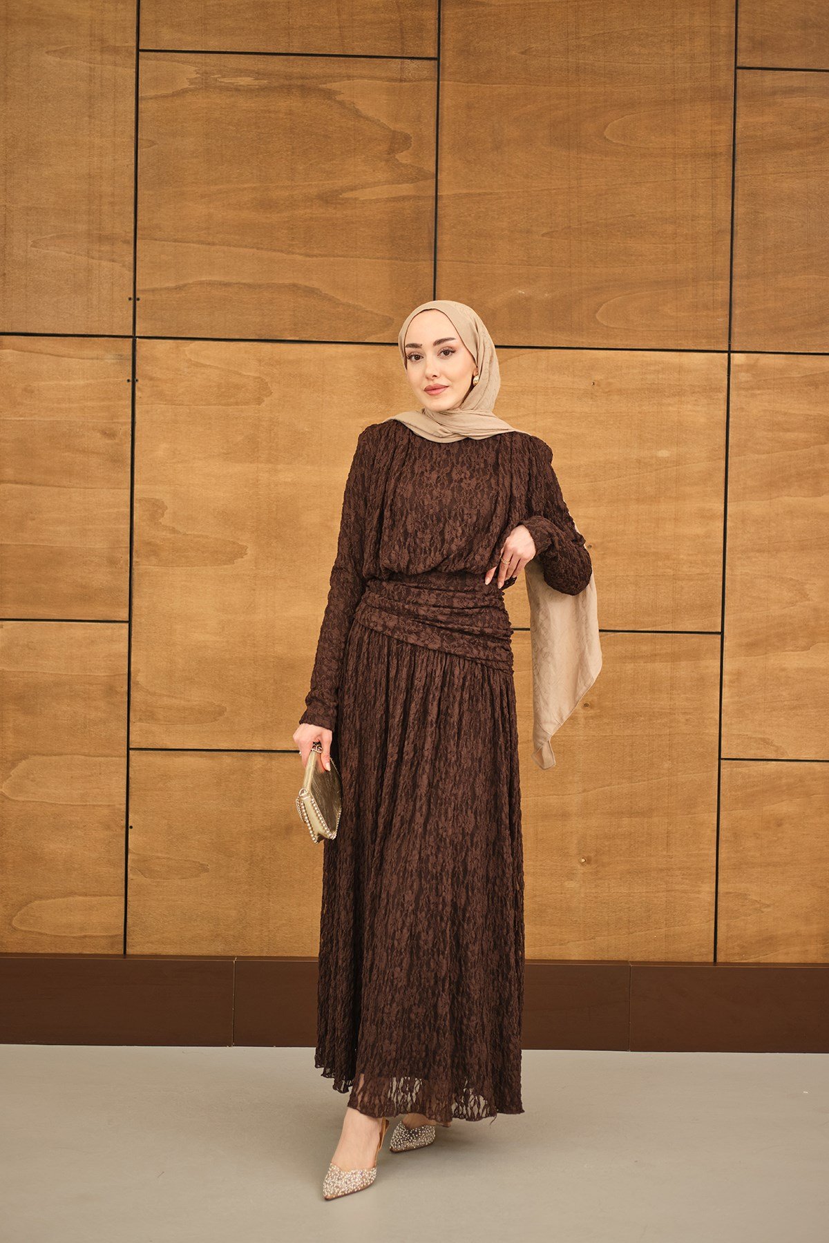 Tül Kumaş Kendinden Desenli Bel Büzgü Detay Elbise Kahverengi