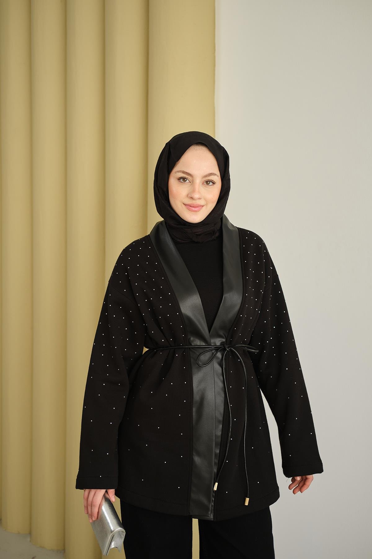 V Detay Deri Yaka Taşlı Ceket Siyah