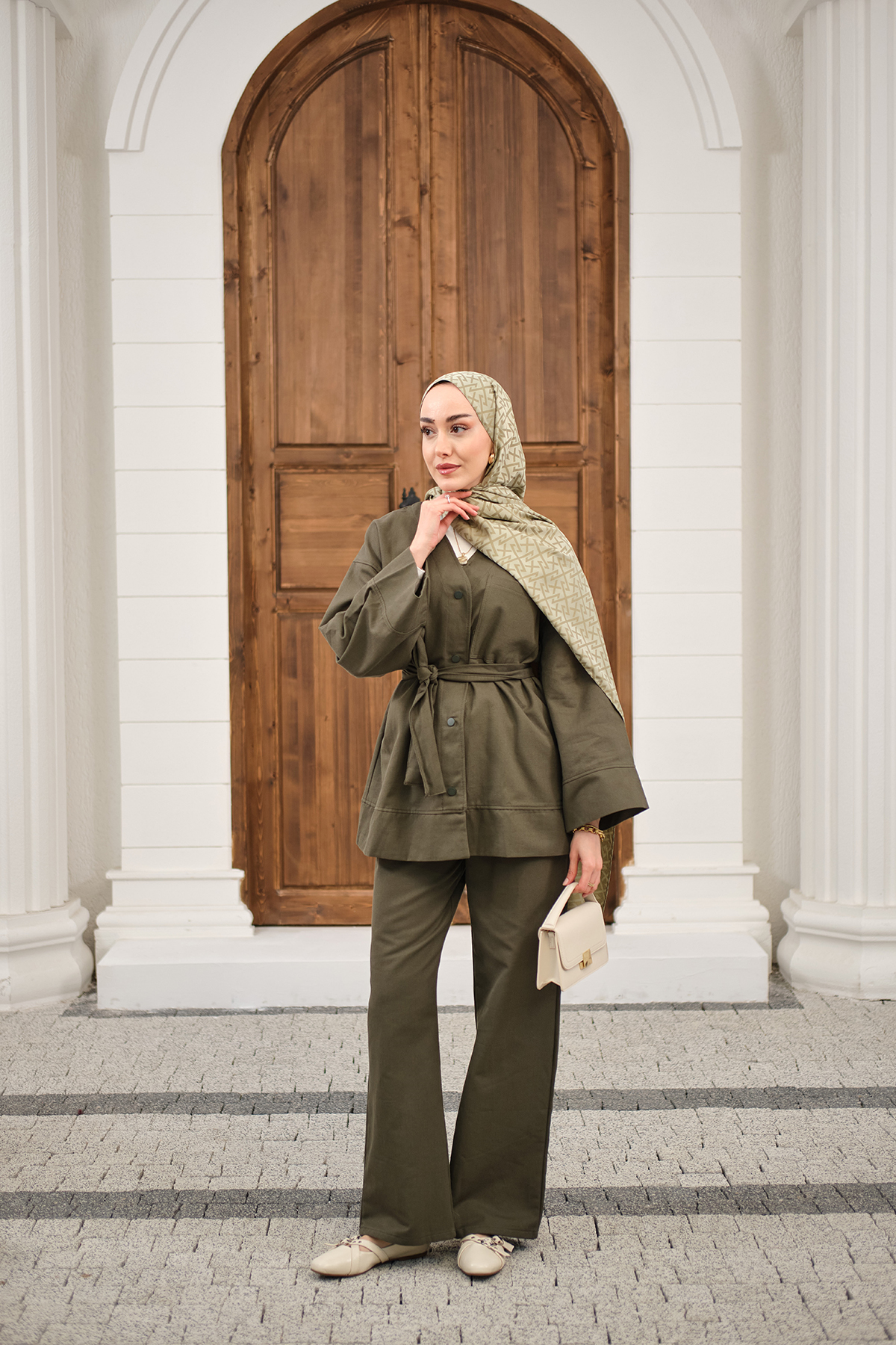 V Yaka Çıtçıtlı Tek Cep Detay Bel Bağlamalı Pike Takım Haki Yeşil