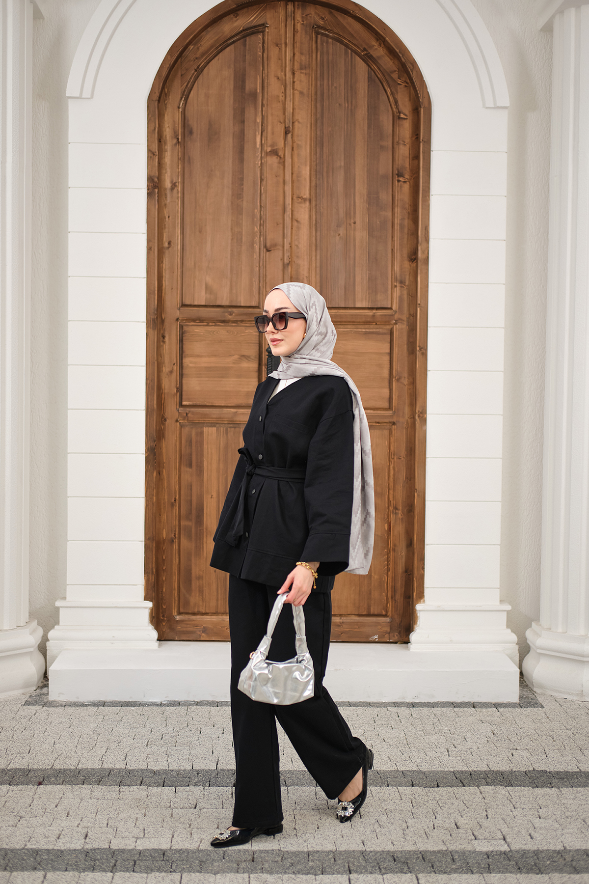 V Yaka Çıtçıtlı Tek Cep Detay Bel Bağlamalı Pike Takım Siyah
