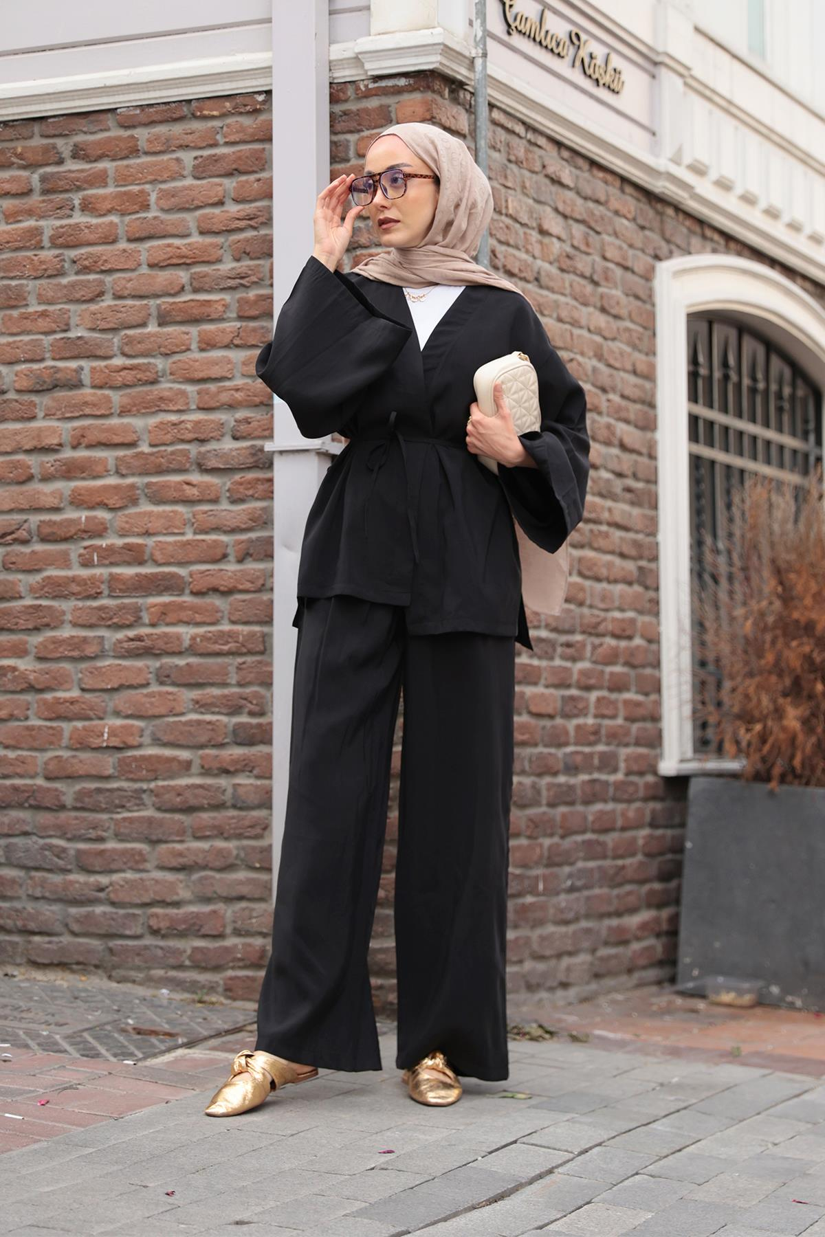 Editör Notu: V Yaka İkili Takım Siyah, Rahat kalıbı ve kuşak detaylı üstüyle öne çıkan bu takım, modern ve özgüvenli bir duruş sunar. Geniş paça pantolonu ve dökümlü kumaşıyla hem konfor hem de şıklık bir arada. Günlük stilde sade ama güçlü bir ifade arayanlara hitap eder.