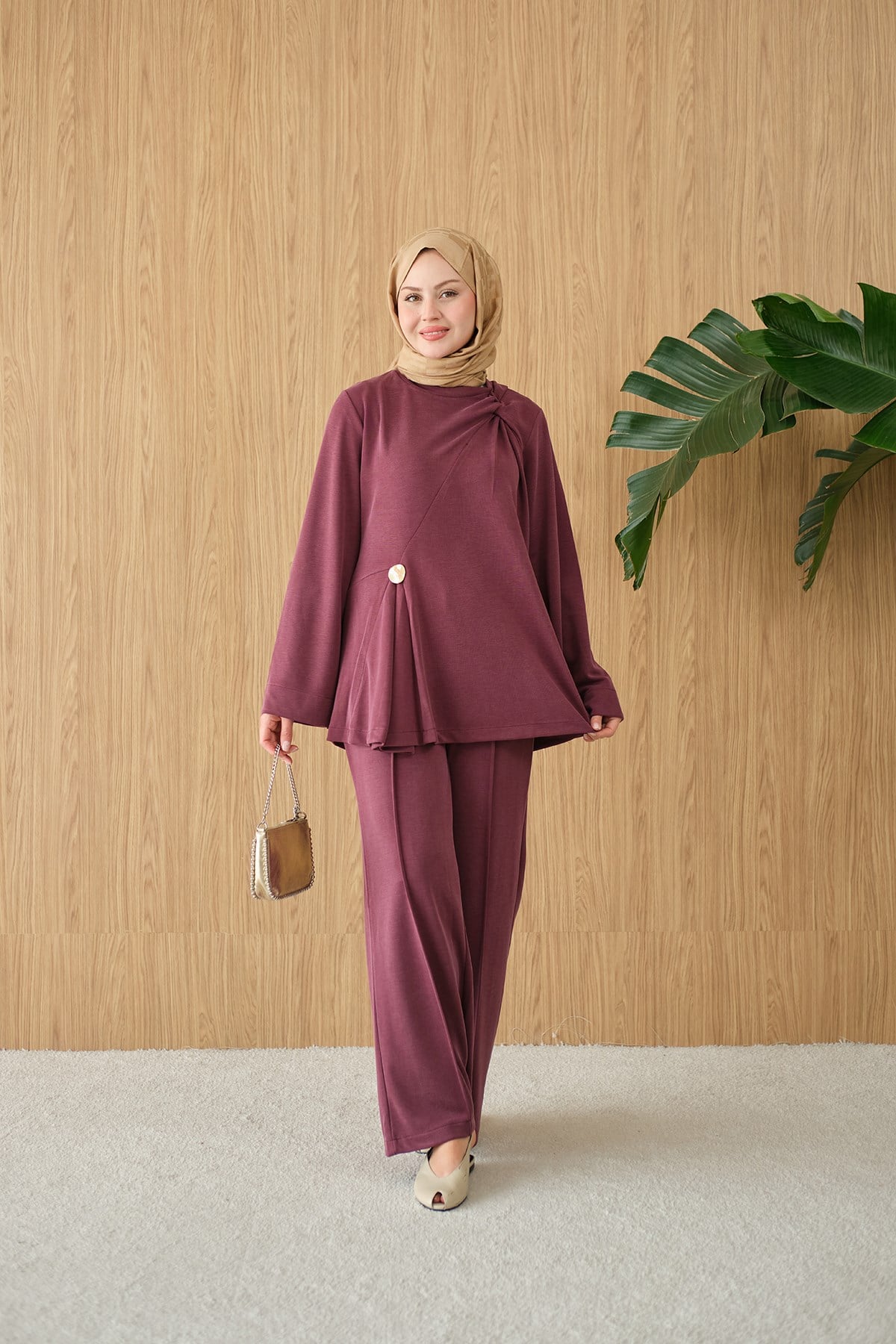 Yaka Bağlama Detay Tokalı Bisiklet Yaka Takım Mürdüm