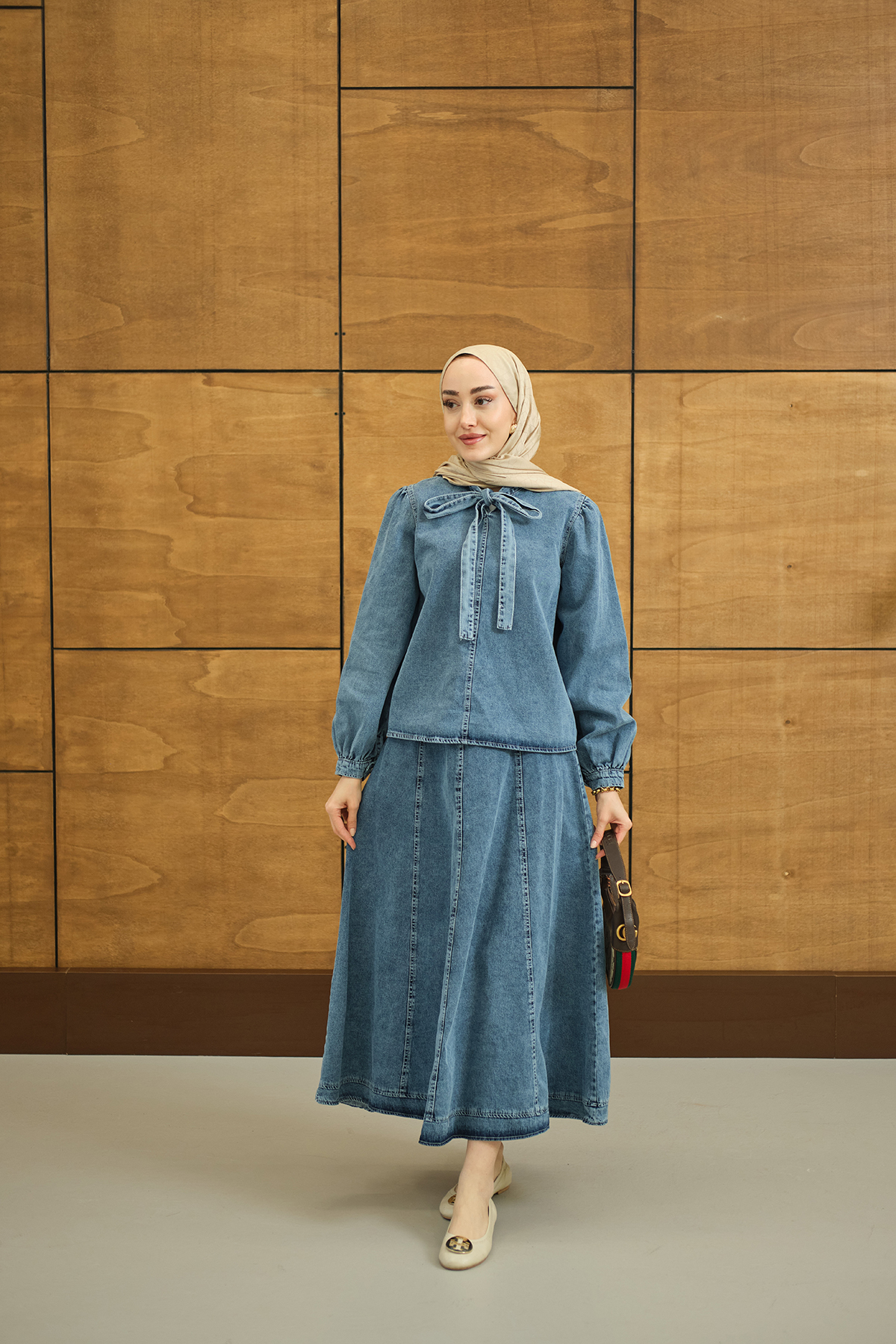 Yaka Bağlamalı Etekli Kot Takım Buz Mavi