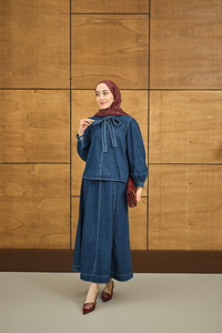 Yaka Bağlamalı Etekli Kot Takım Lacivert