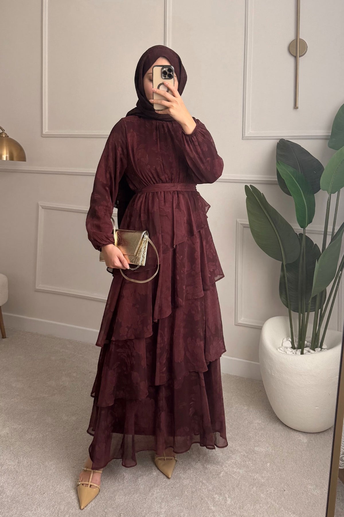 Yaka Büzgülü Bel Bağlamalı Kat Kat Şifon Elbise Bordo