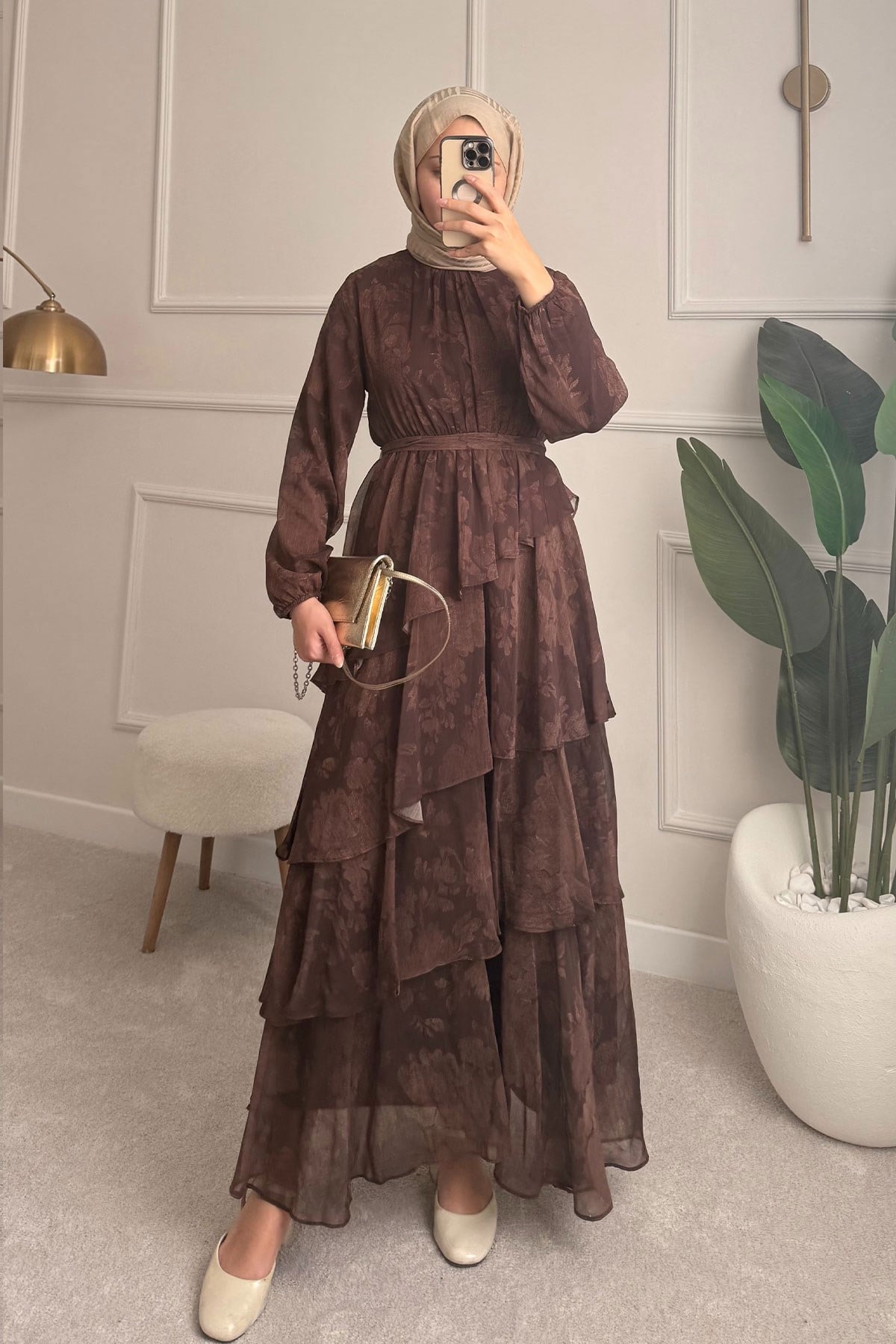Yaka Büzgülü Bel Bağlamalı Kat Kat Şifon Elbise Kahverengi