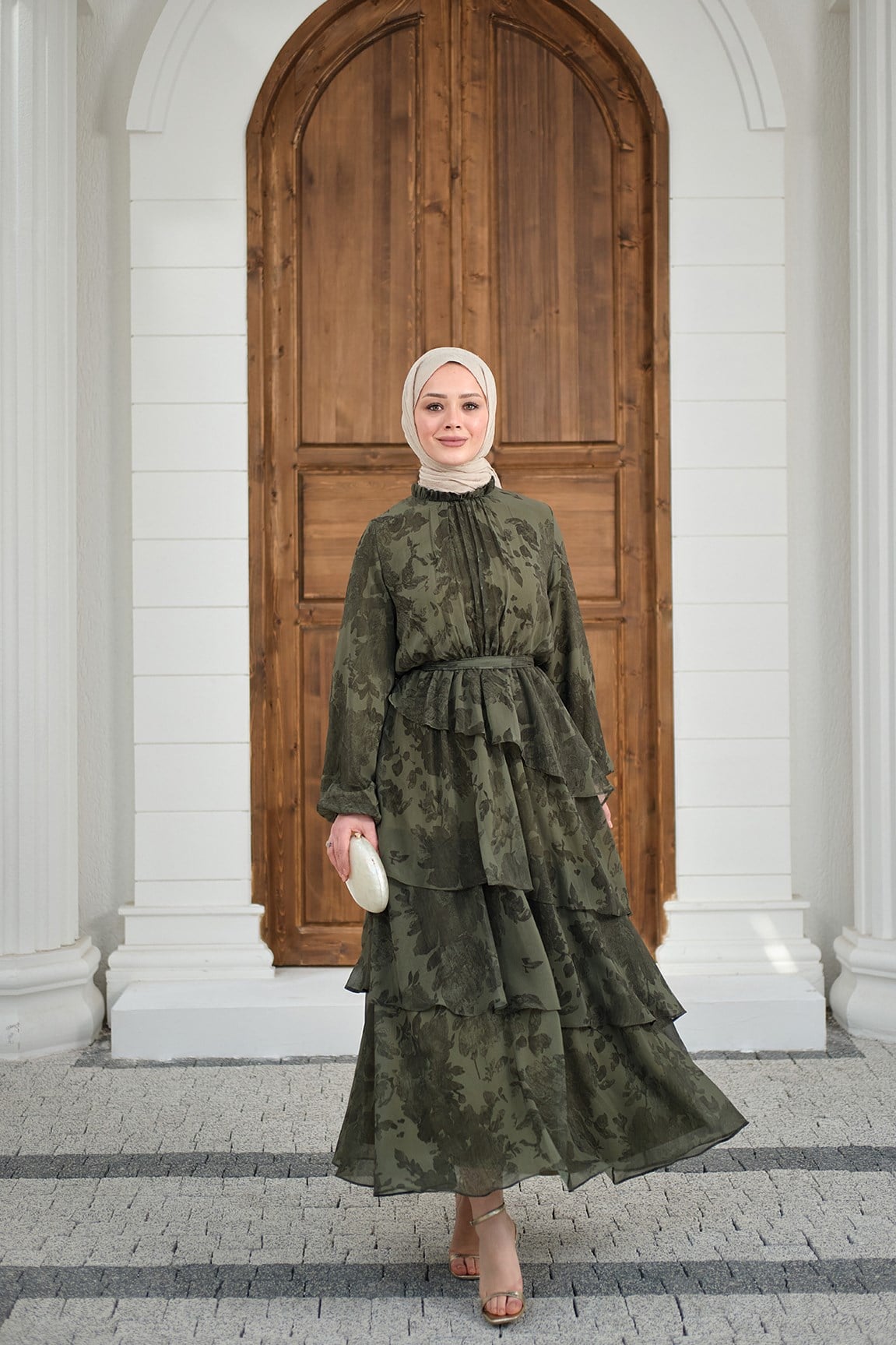 Yaka Büzgülü Bel Bağlamalı Kat Kat Şifon Elbise Yeşil