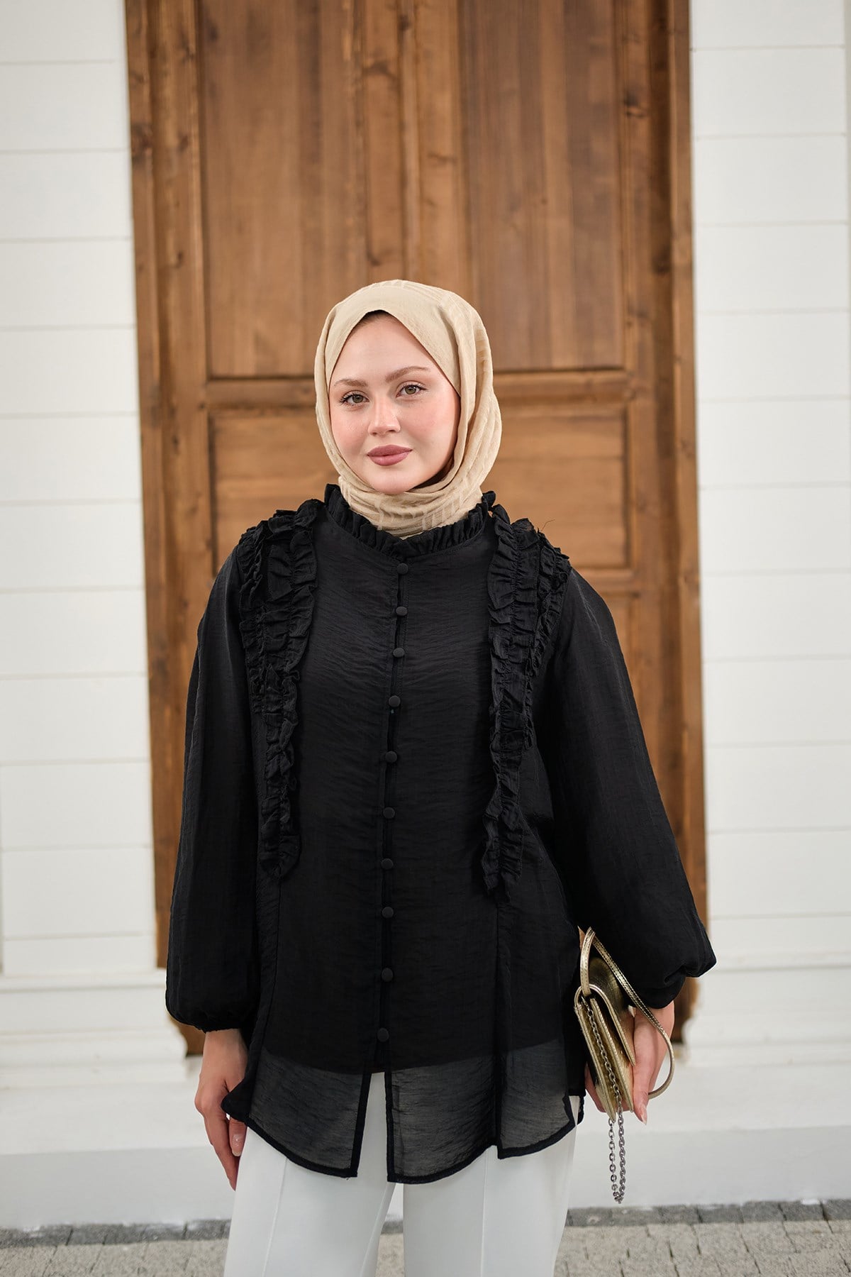 Yaka Büzgülü Gömlek Siyah