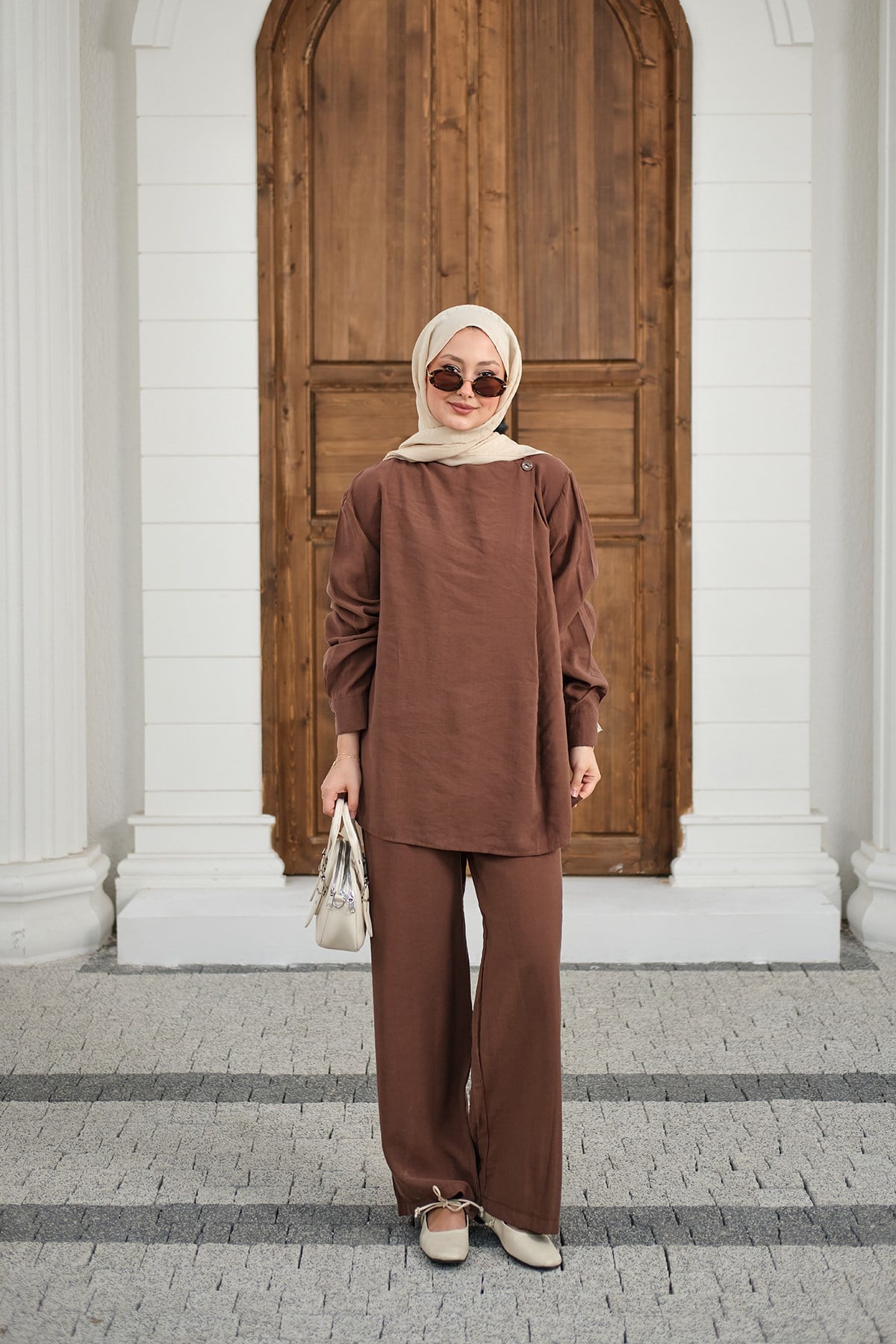 Yaka Düğme Detay Beli Lastikli Ayarlanabilir İkili Takım Kahverengi