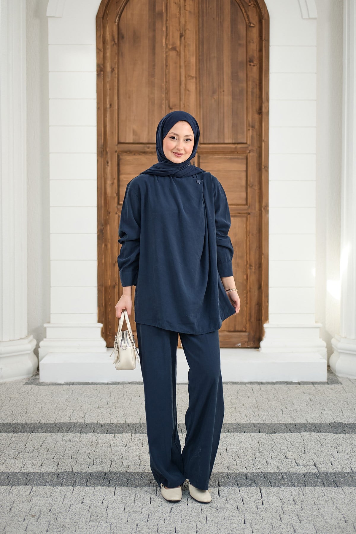 Yaka Düğme Detay Beli Lastikli Ayarlanabilir İkili Takım Lacivert