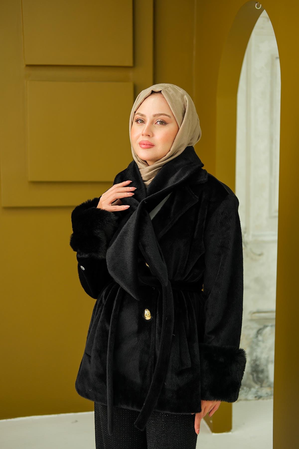 Yaka Fiyonklu Kürklü Kaşe Siyah