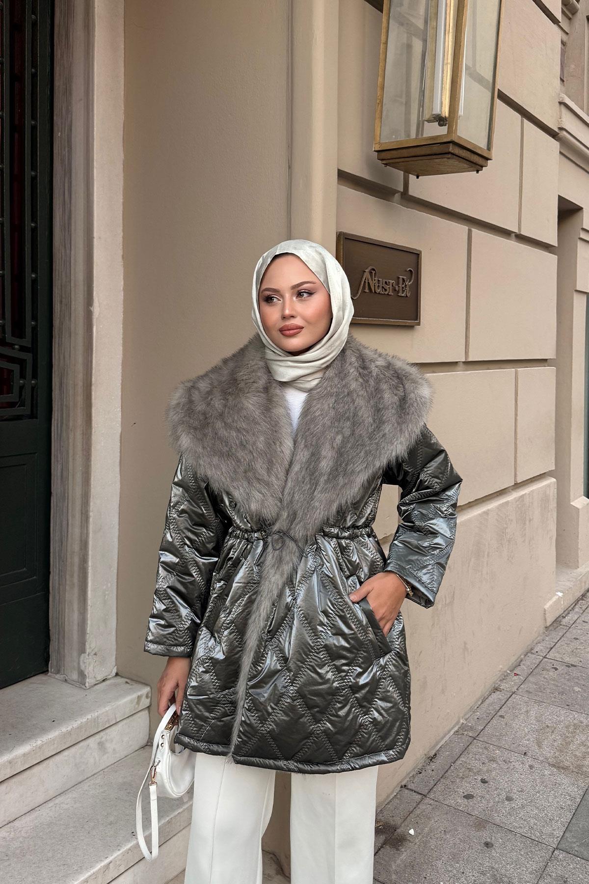 Yaka Kürklü Dikiş Detay Mont Antrasit