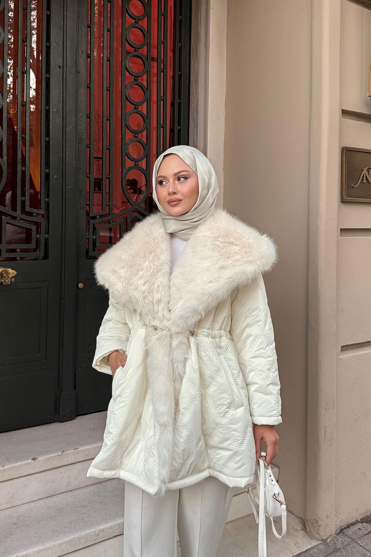 Yaka Kürklü Dikiş Detay Mont Beyaz