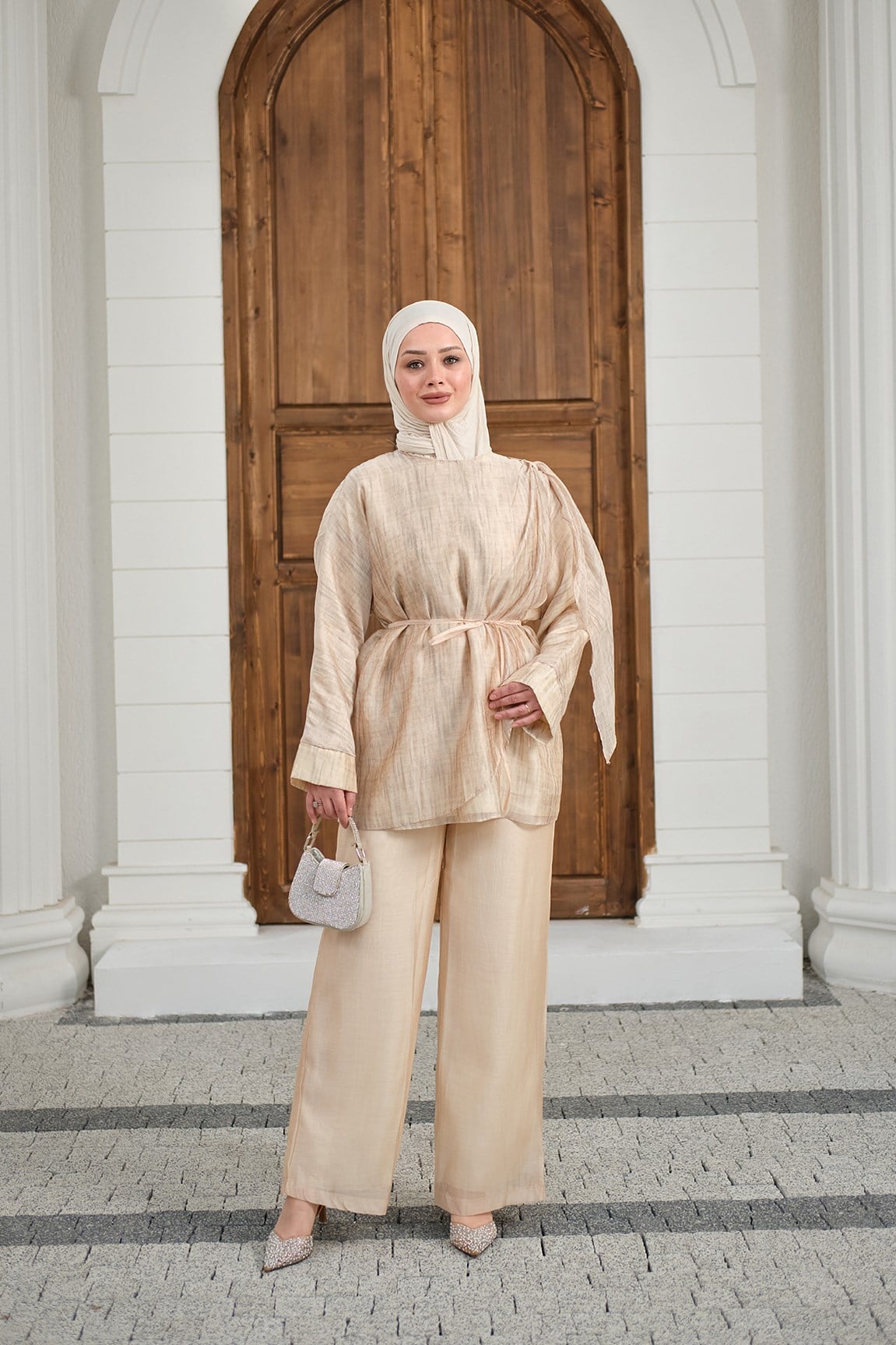 Yaka Şal Detay Bel Bağlamalı Takım Krem