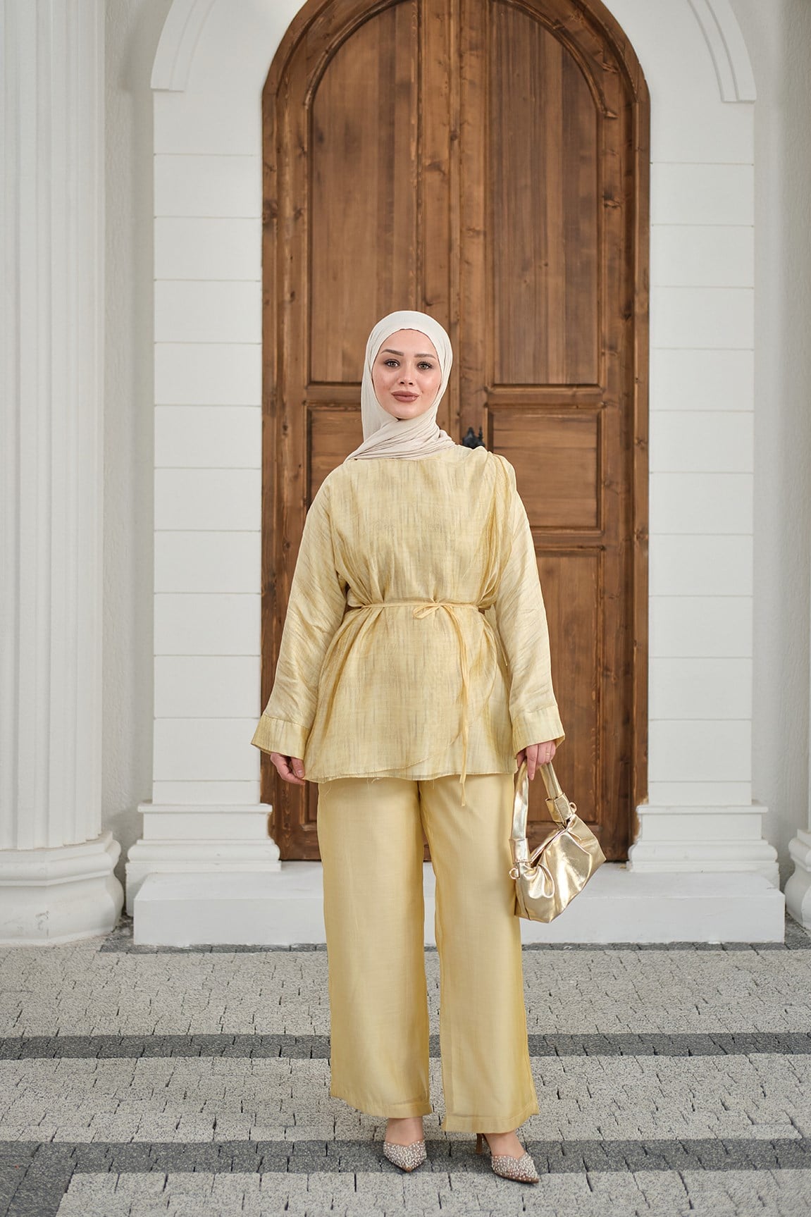 Yaka Şal Detay Bel Bağlamalı Takım Sarı