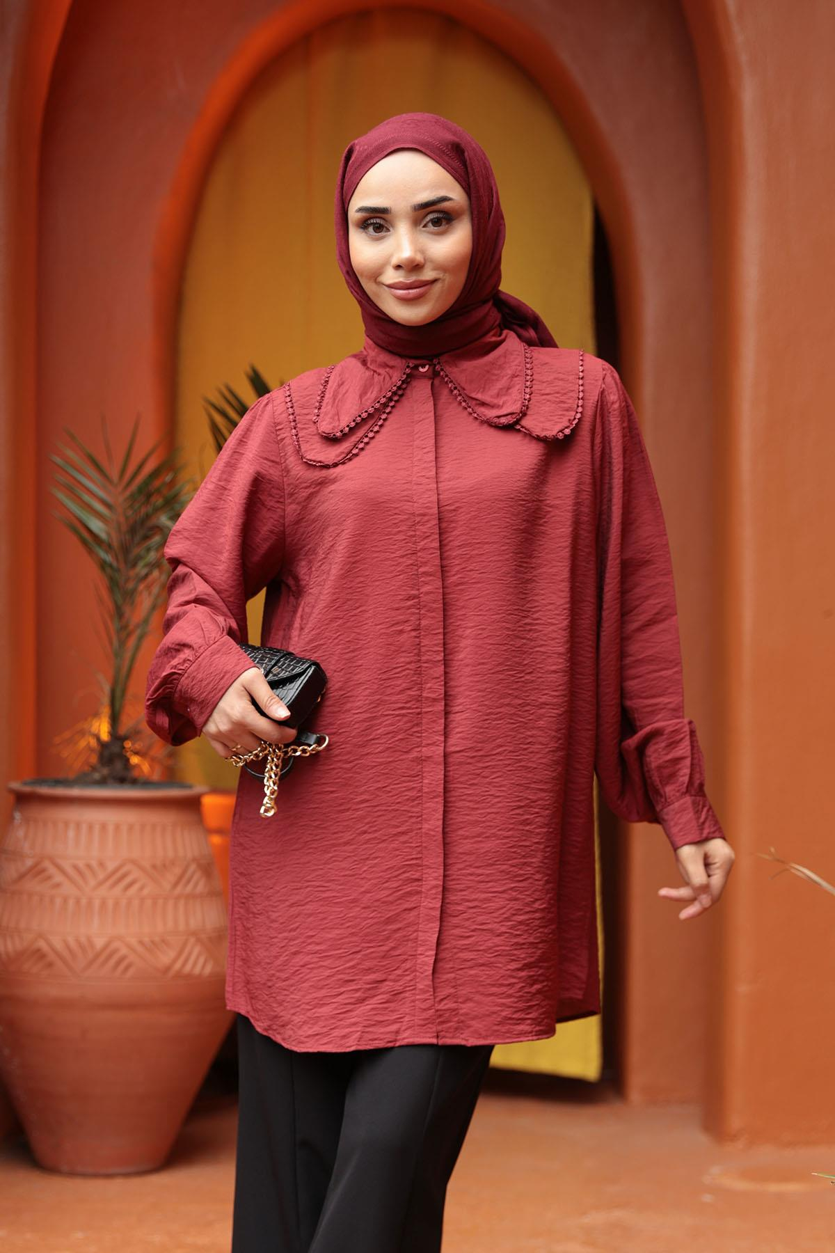 Yakası Dantel Detaylı Gömlek Bordo