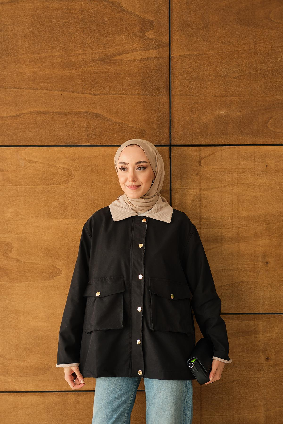 Yakası Ve Bilekleri Kadife Detaylı Ceket Siyah