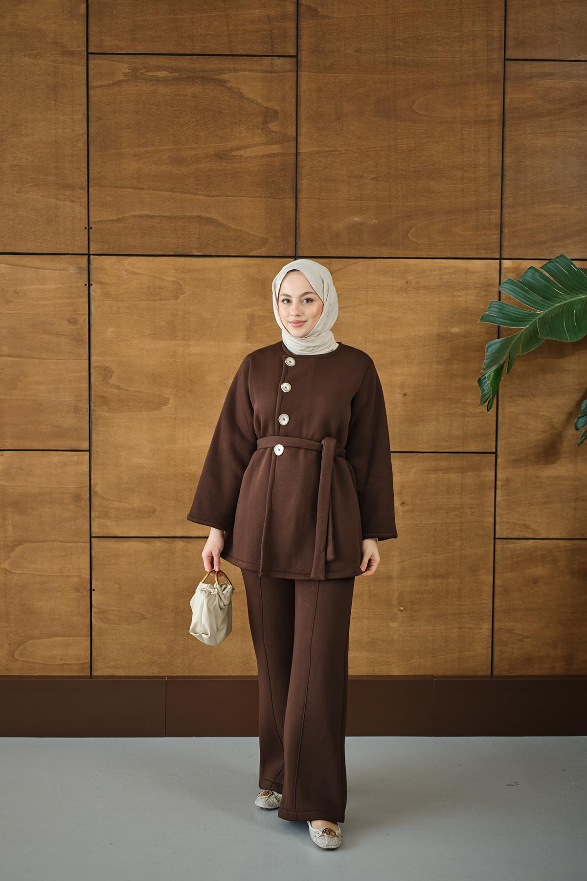 Yan Düğmeli Bel Bağlamalı Midi Boy Takım Kahverengi