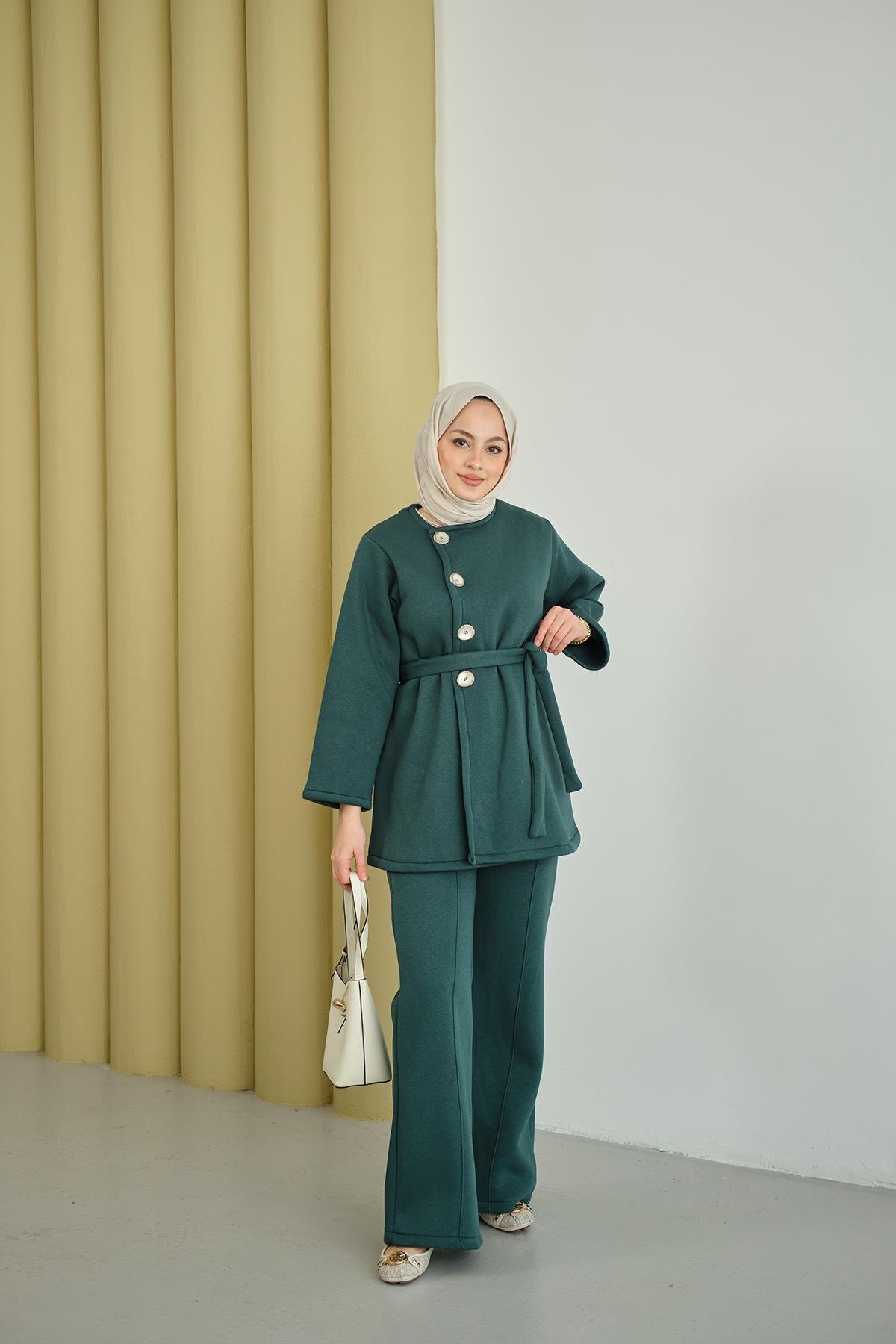 Yan Düğmeli Bel Bağlamalı Midi Boy Takım Yeşil