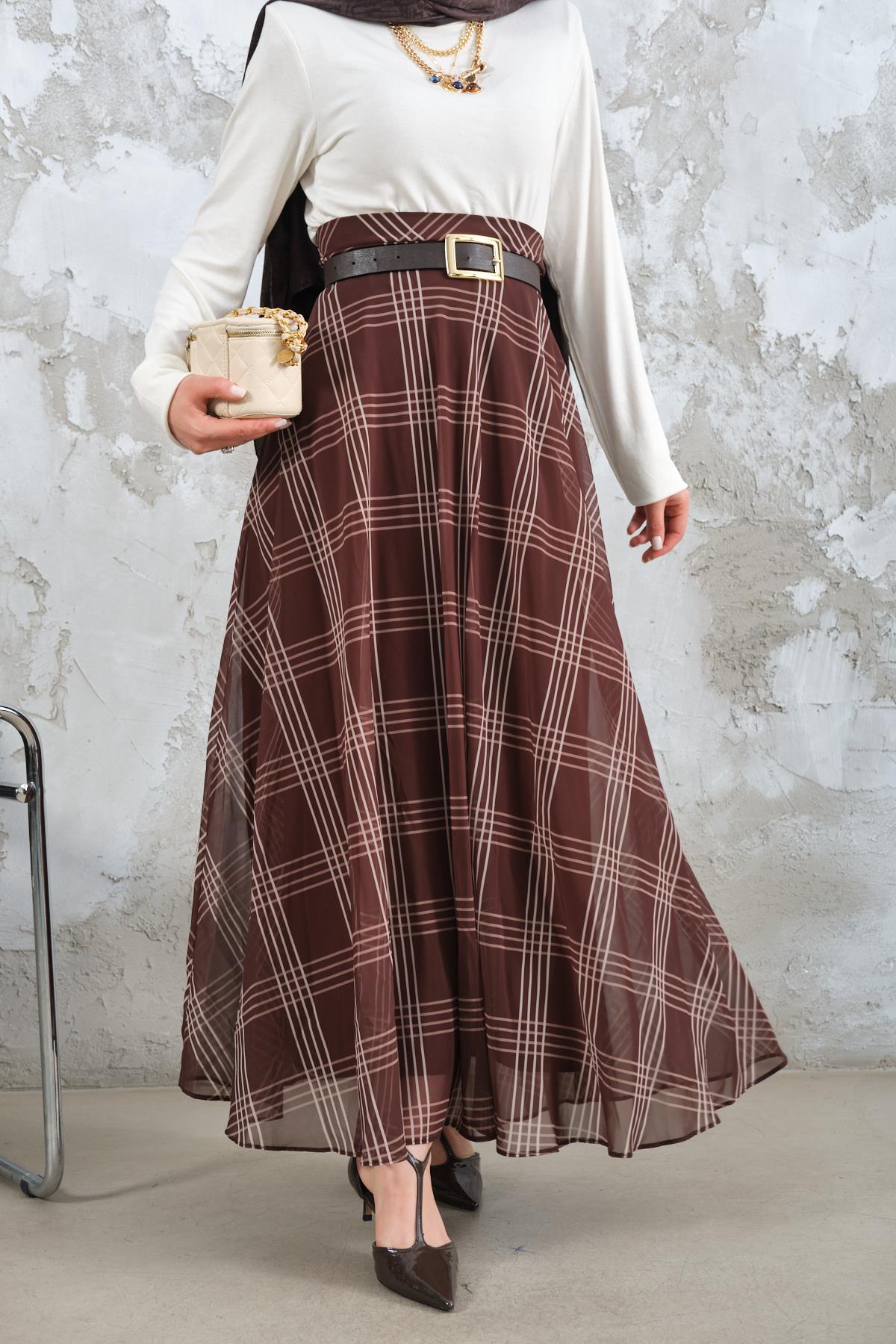 Yan Fermuarlı Kare Desen Şifon Etek Kahverengi