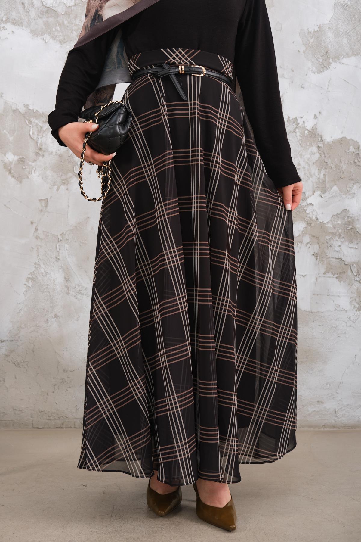 Yan Fermuarlı Kare Desen Şifon Etek Siyah