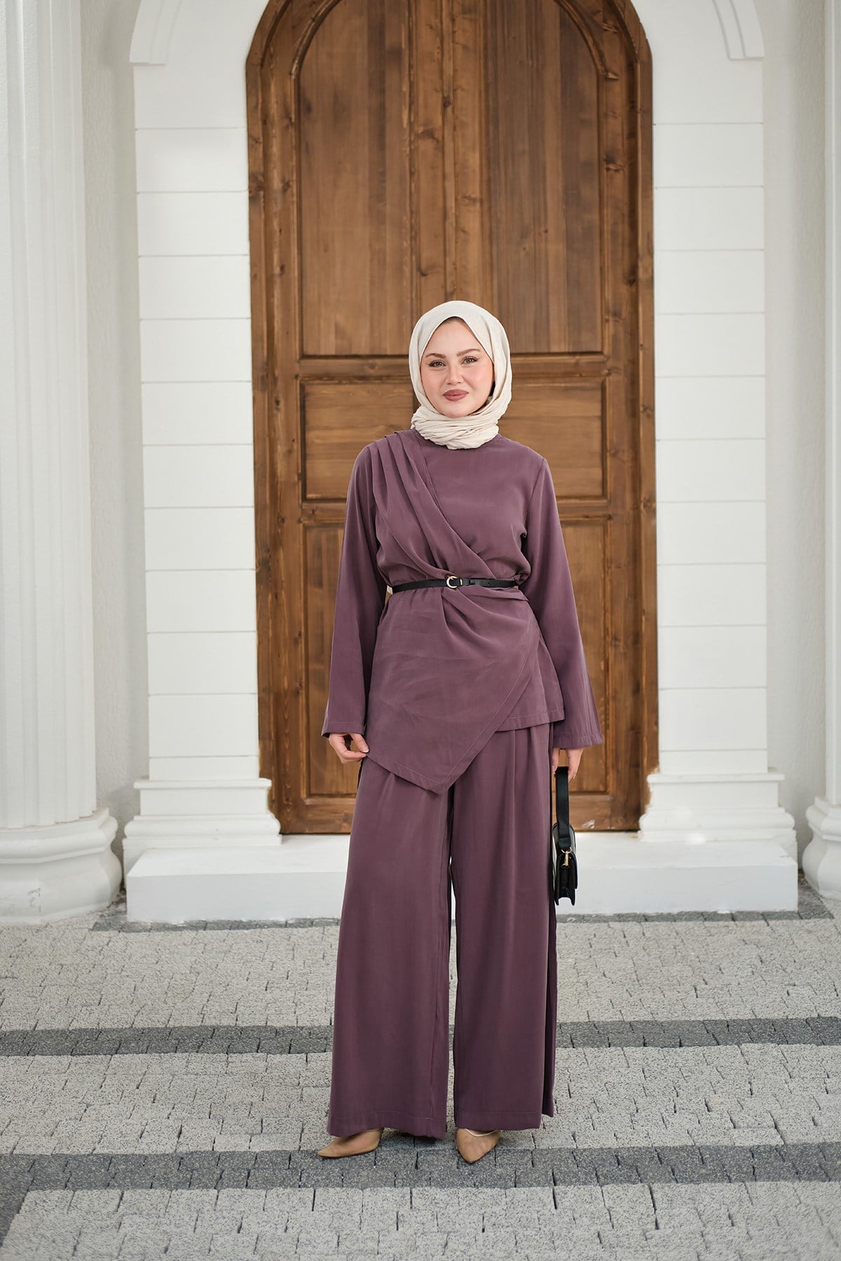Yandan Dikişli Parça Detay Pantolonlu Takım Mürdüm