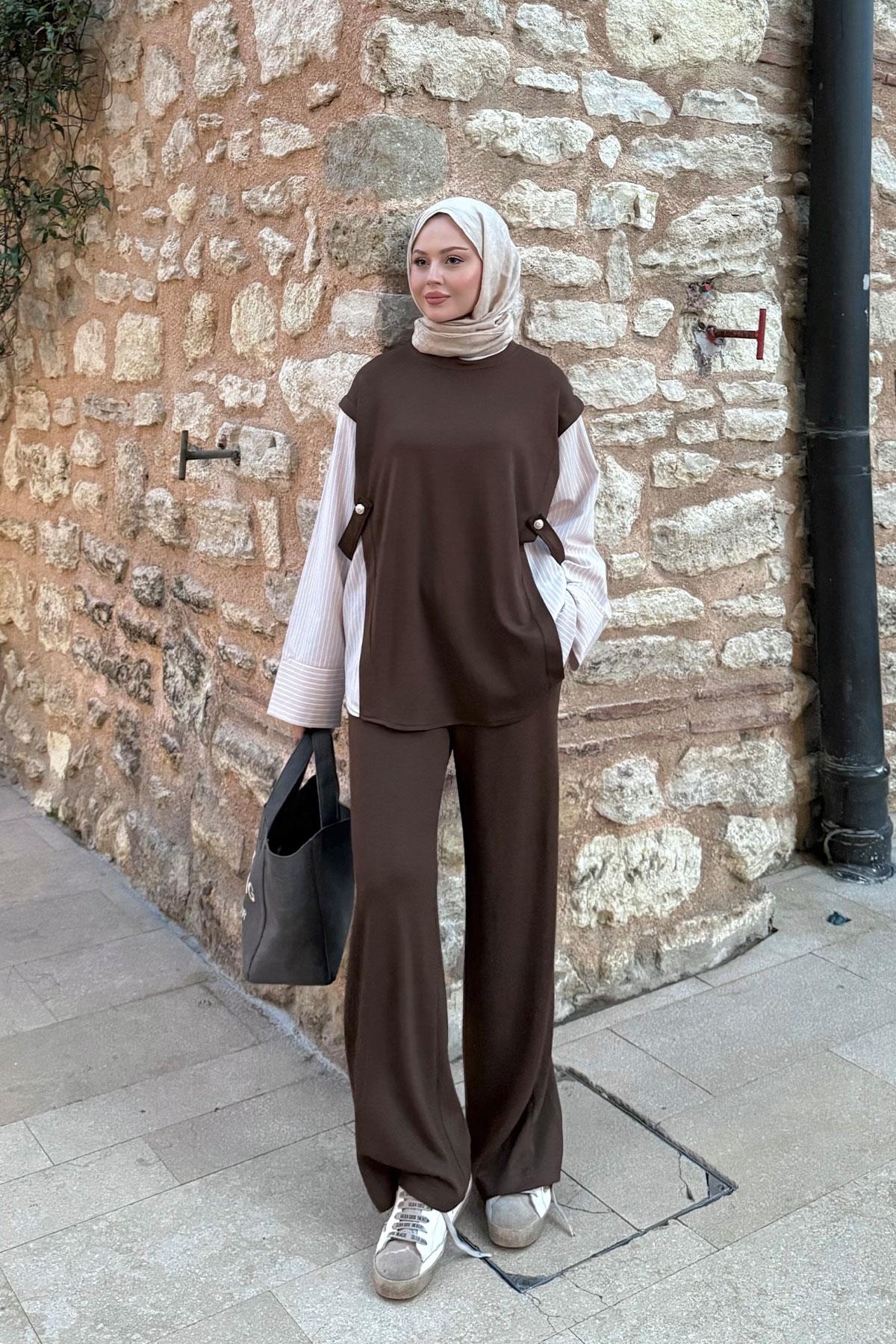 Yandan Düğmeli Gömlek Detaylı Takım Kahverengi