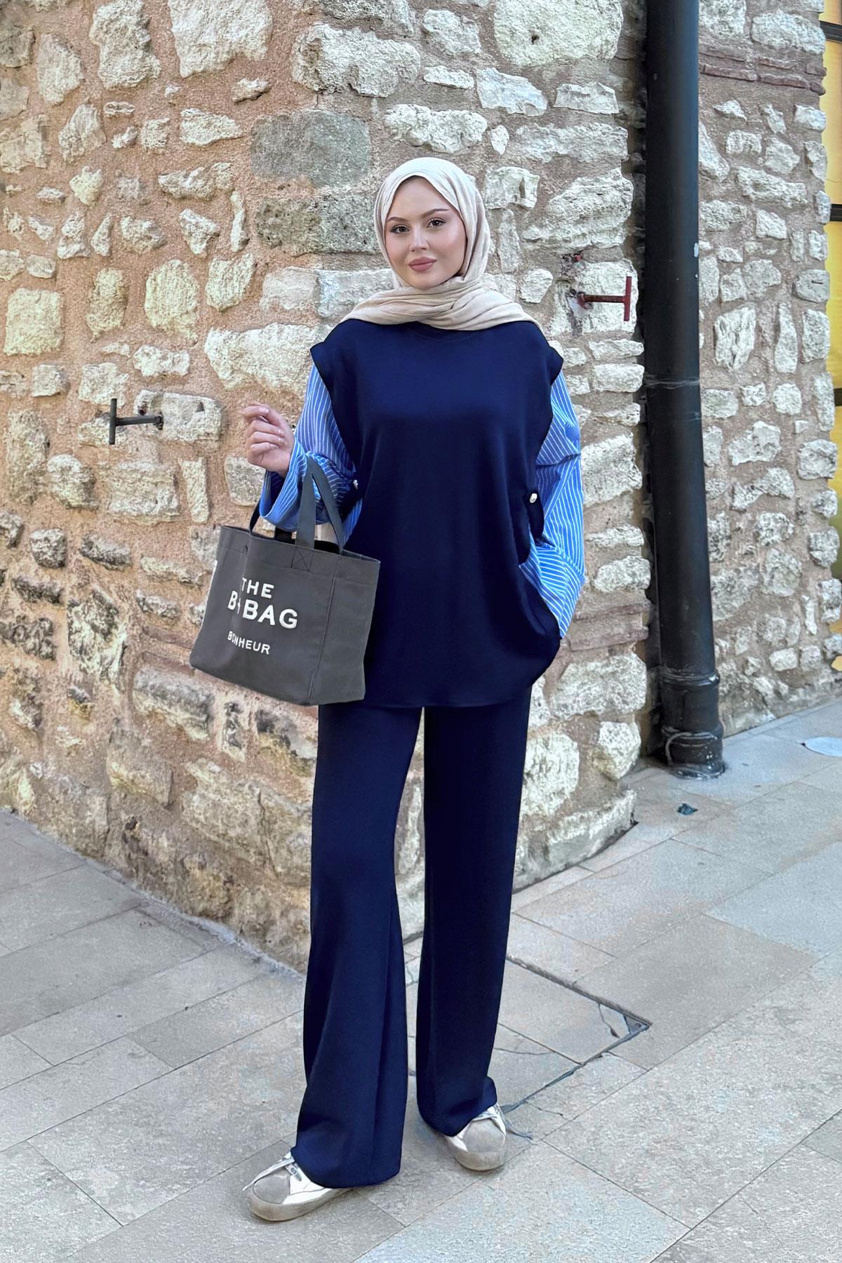 Yandan Düğmeli Gömlek Detaylı Takım Lacivert
