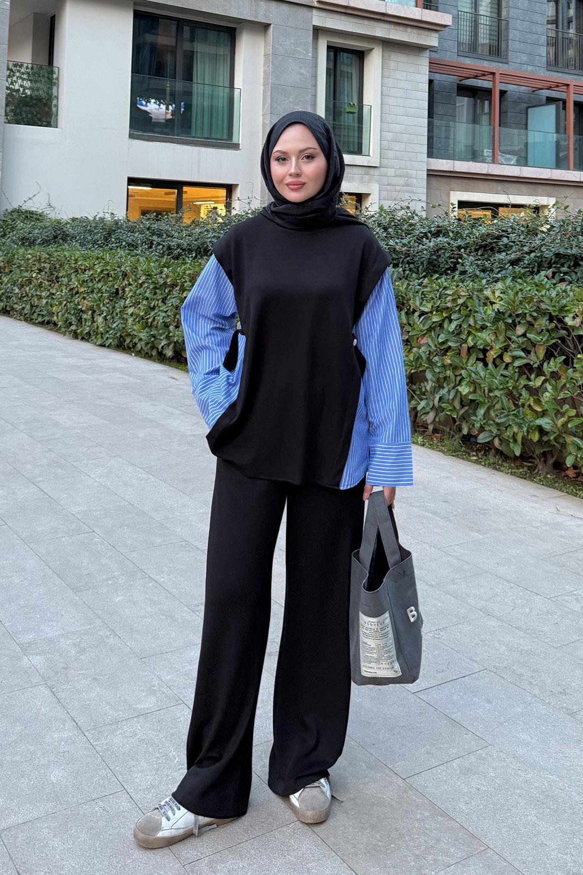 Yandan Düğmeli Gömlek Detaylı Takım Siyah