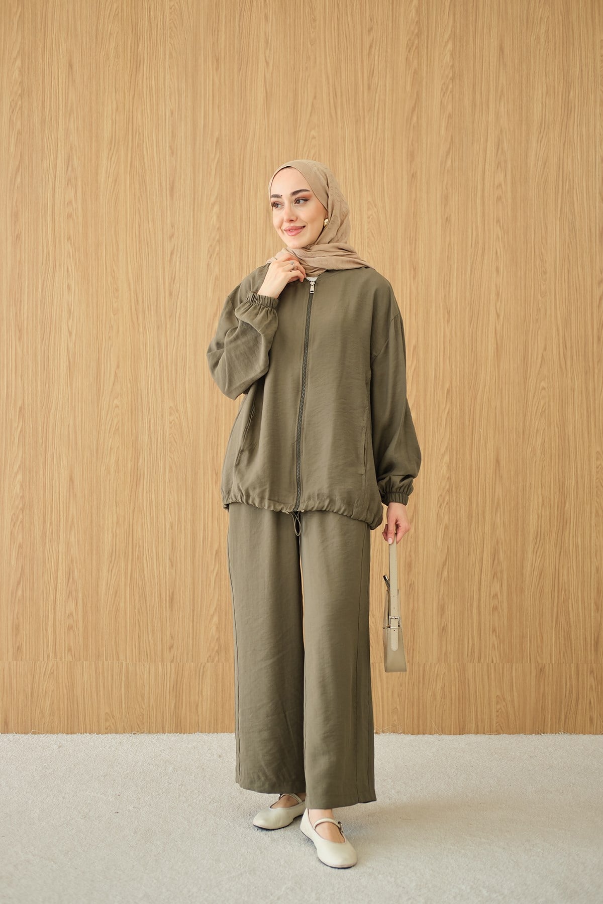 Yanları Dikiş Detay Fermuarlı Takım Yeşil