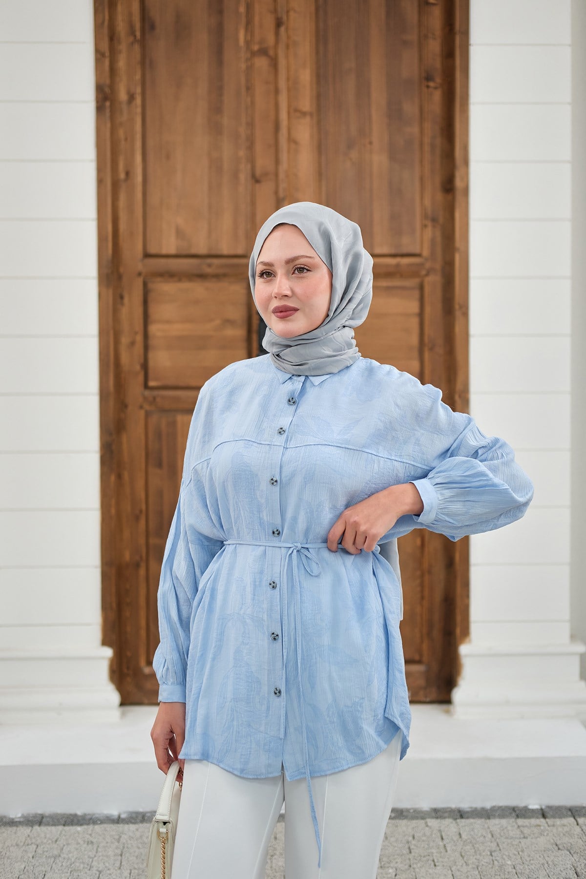 Yaprak Desen Bel Bağlamalı Gömlek Mavi