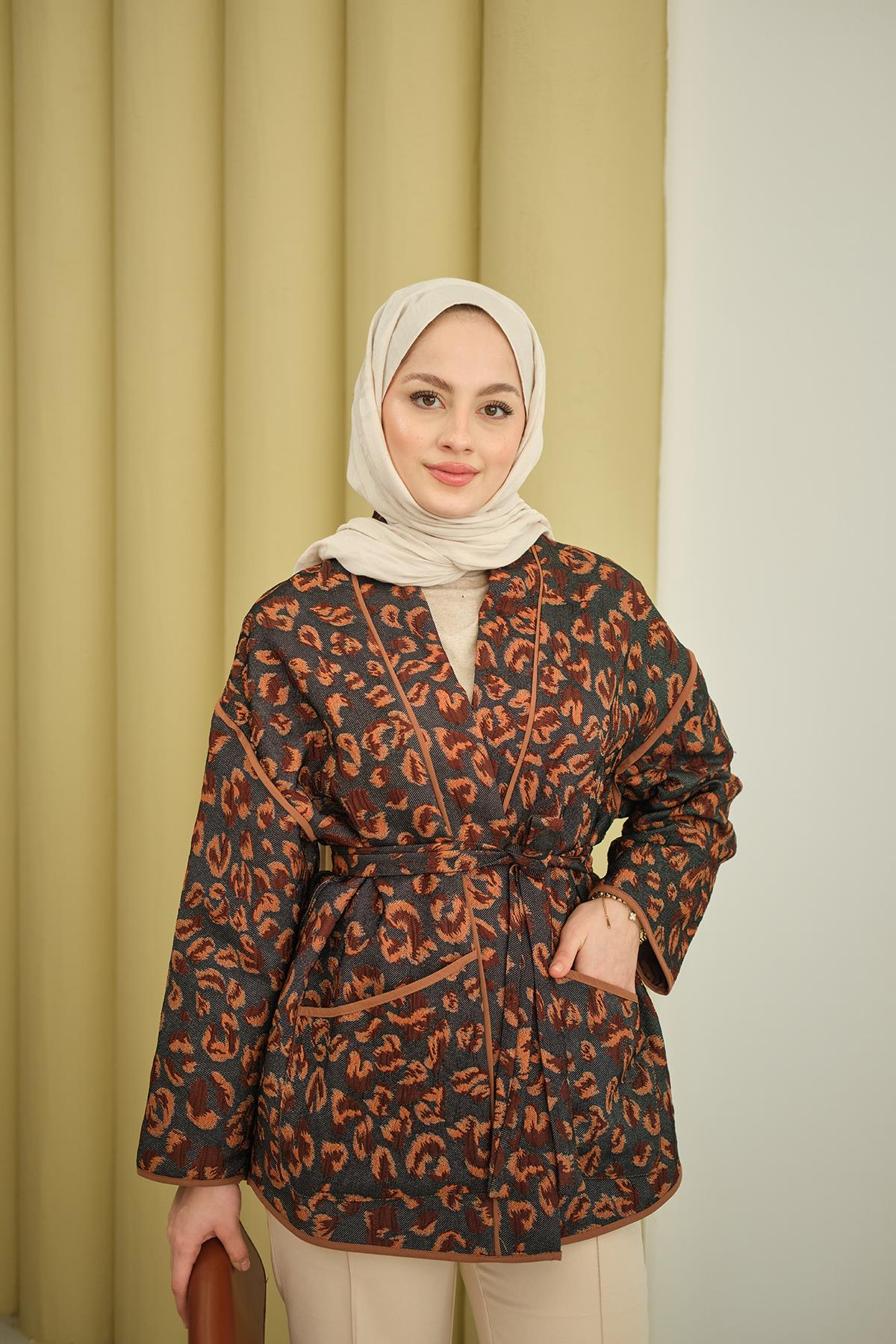 Yaprak Desen Şal Yaka Biyeli Ceket Kahverengi