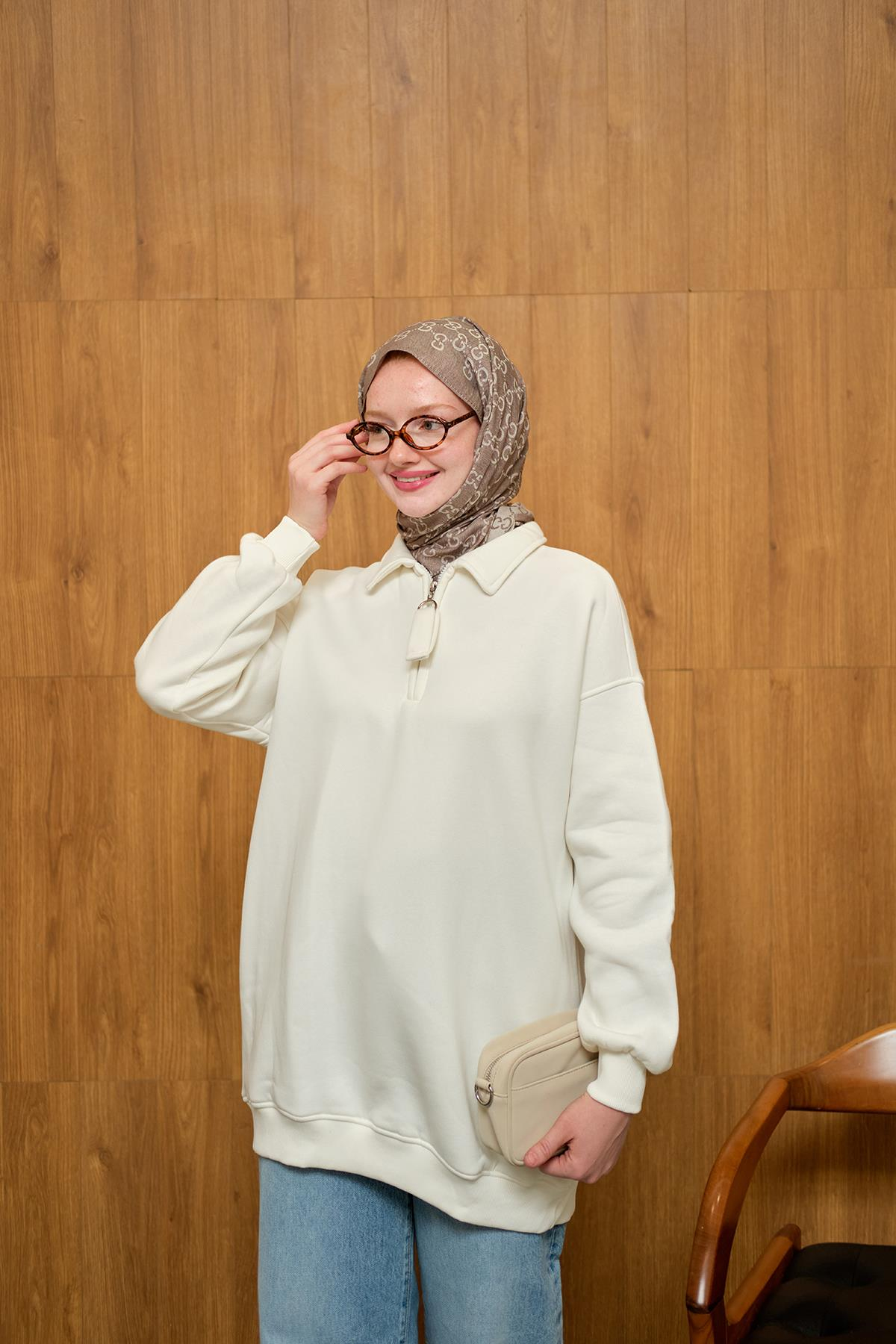 Yarım Fermuar Detay Sweat  Beyaz