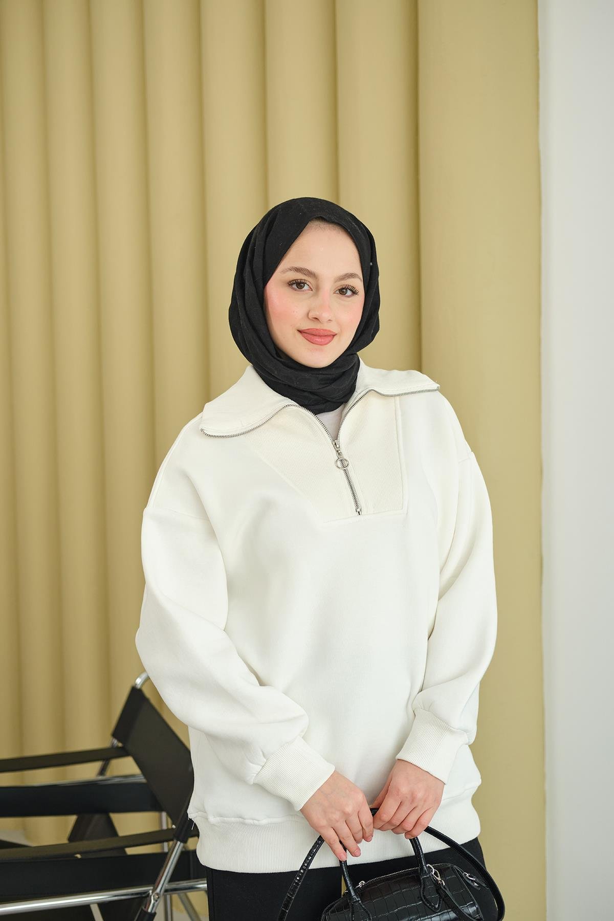 Yarım Fermuarlı Sweat Ekru