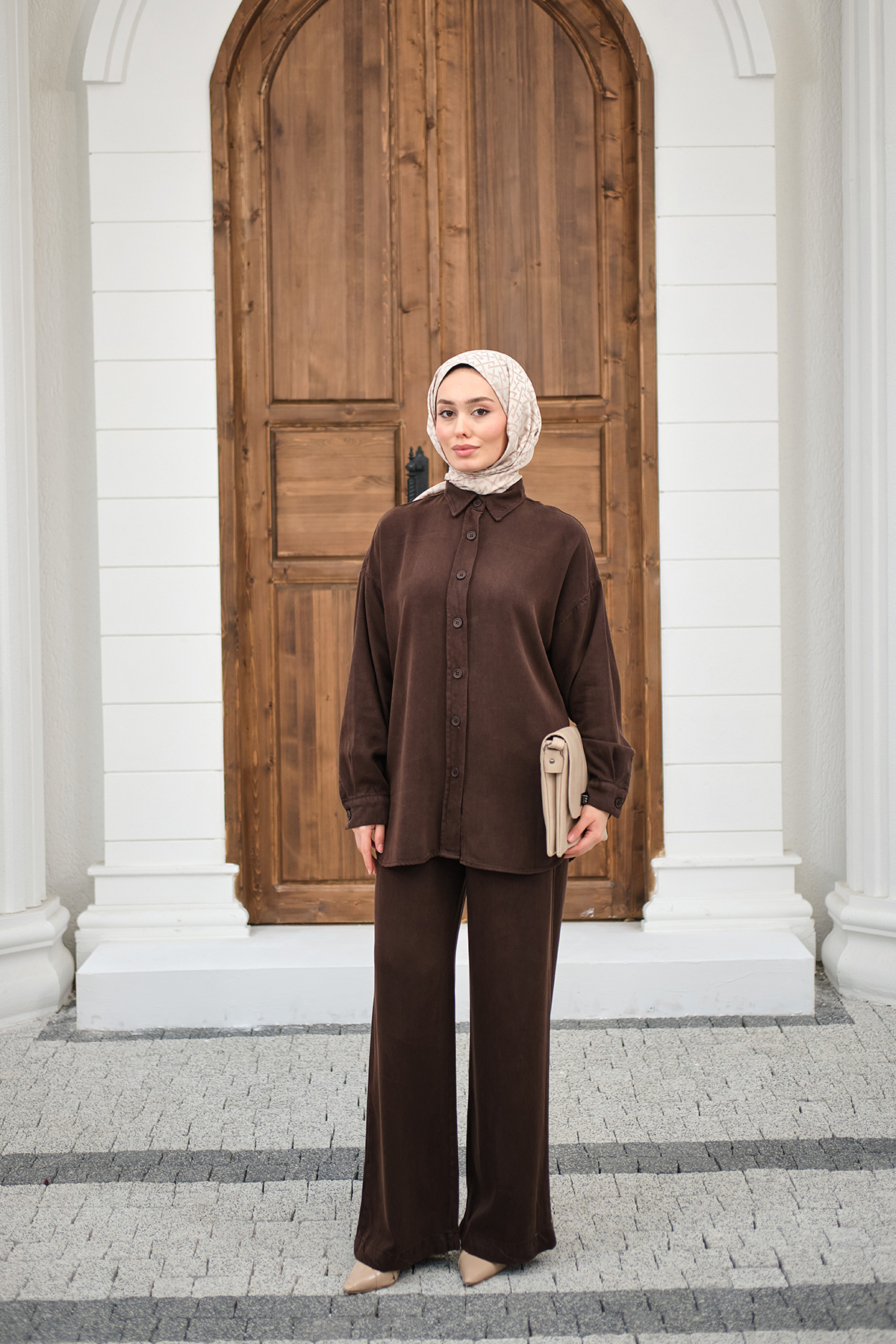 Yıkama Detay Beli Lastikli Boru Paça Gömlekli Takım Kahverengi