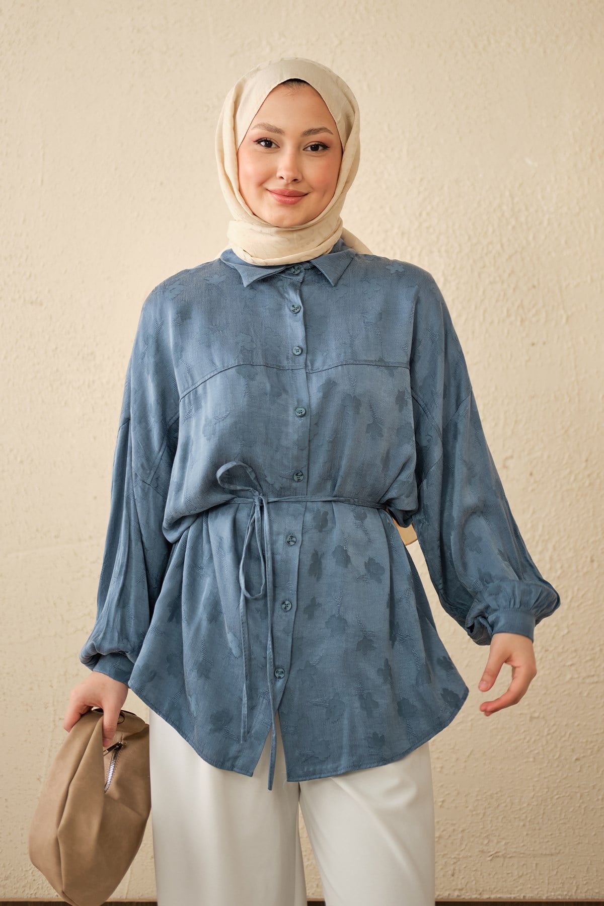 Yonca Desen Saten Bel Bağlamalı Gömlek Mavi
