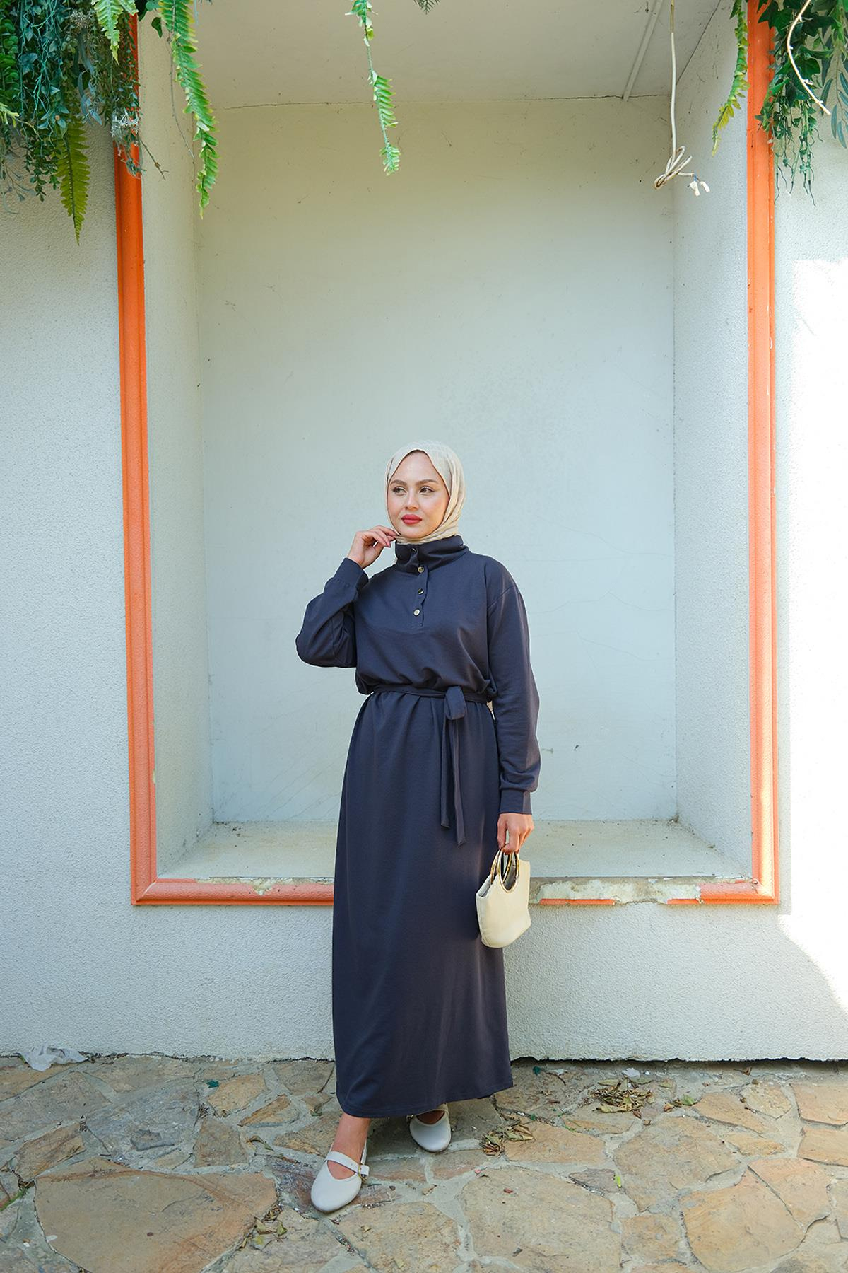 Yüksek Yaka Çıtçıtlı Elbise İndigo Mavi